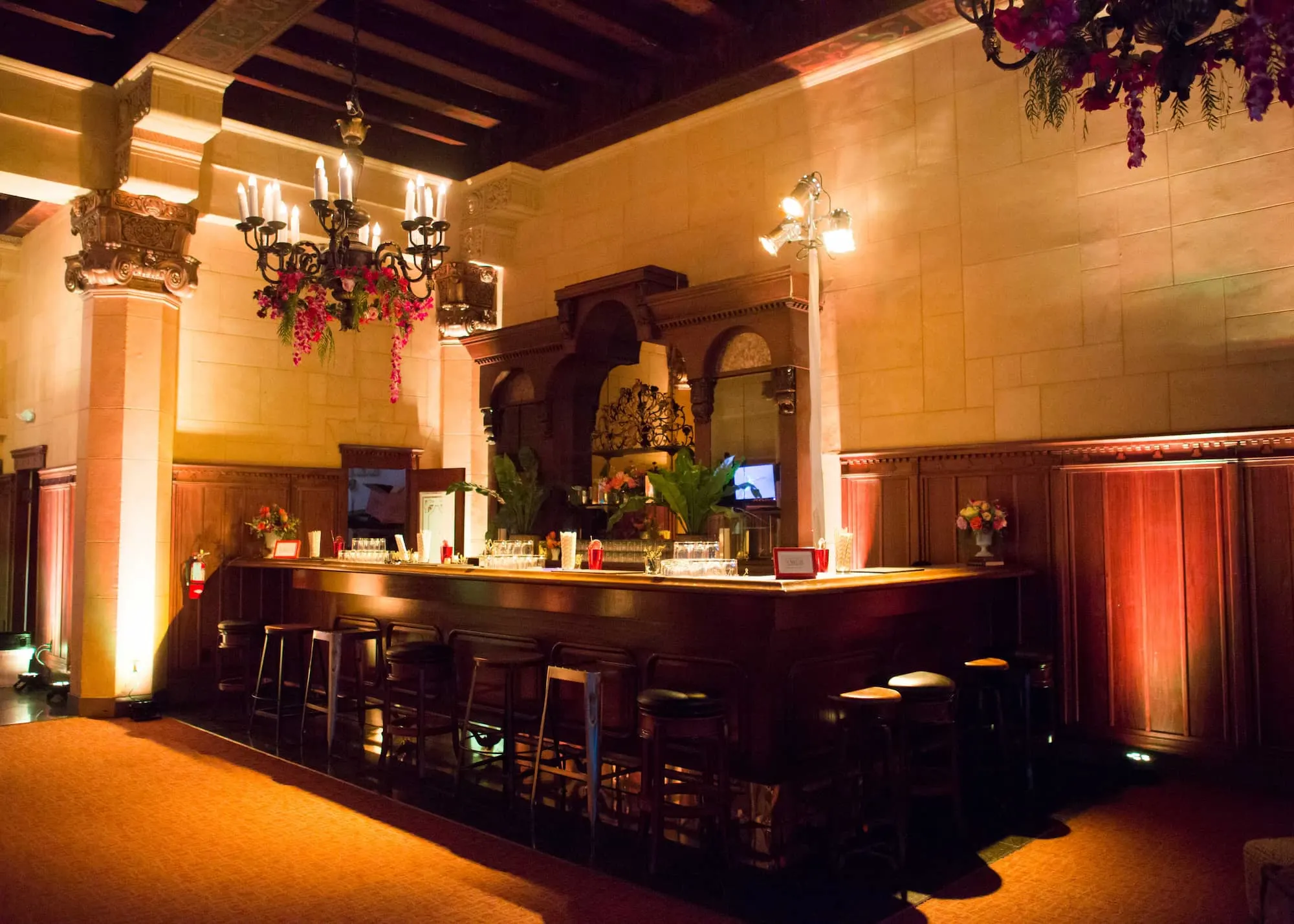 Ideal for cocktails and small seated dinners, Beelman Lounge was formerly used as the Elks’ private cigar room. Intricately fabricated with dark wood wainscoting, tasseled antique chandeliers, and Corinthian columns.